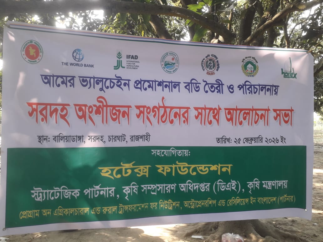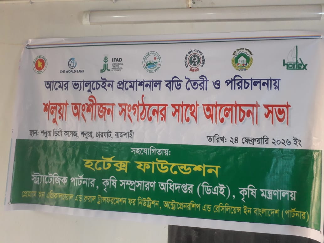 হর্টেক্স ফাউন্ডেশন, ডিএই, ডিএএম, বিএআরসি, বিএআরআই-এর সহযোগিতায়, ০৩/০৪/২০২৬ তারিখে ঢাকার মানিক মিয়া অ্যাভিনিউয়ের ফার্মার্স সেন্টারে ‘বাংলাদেশ জিএপি’ ভিত্তিক আলু বিপণন ও রপ্তানি কর্মসূচির আয়োজন করে।